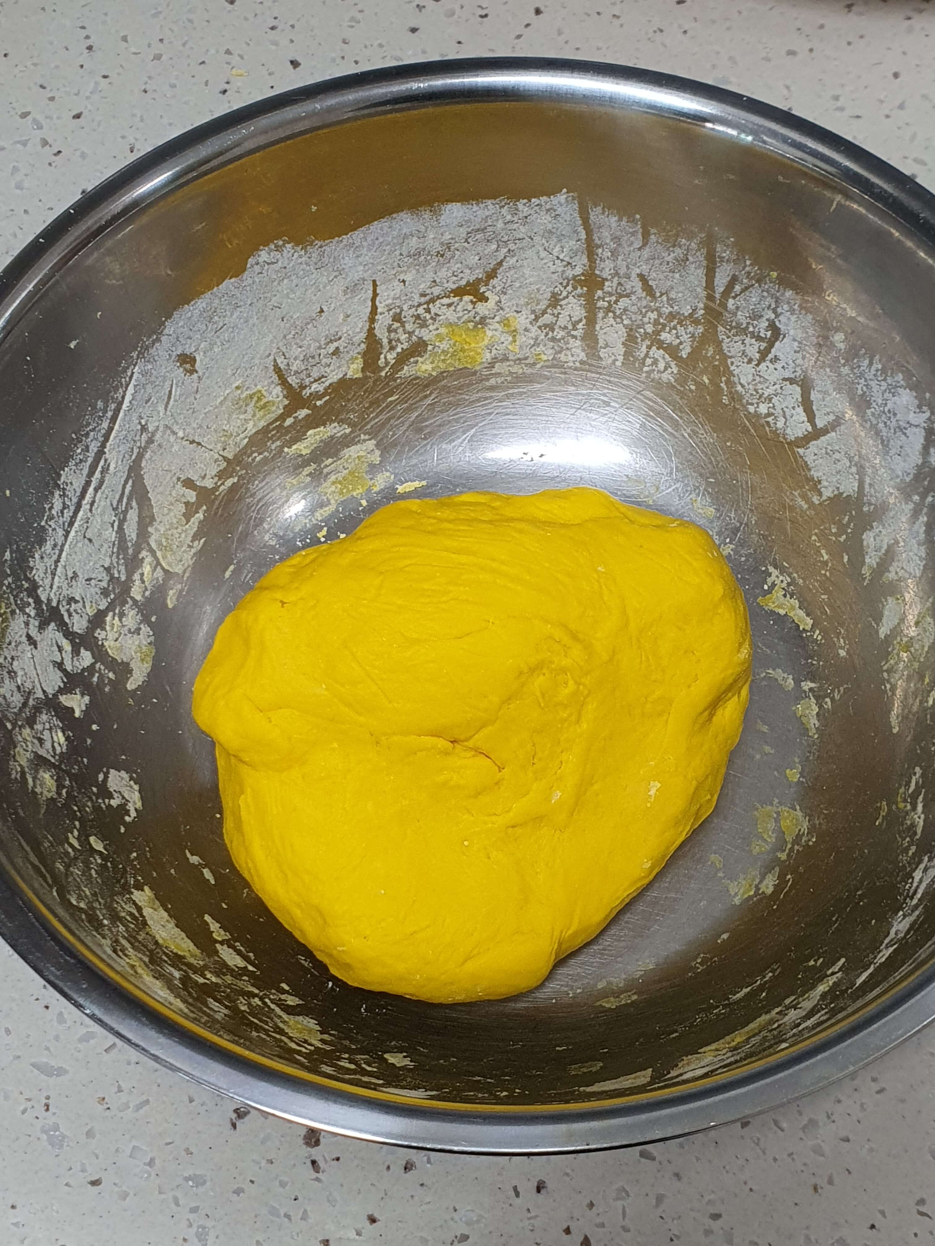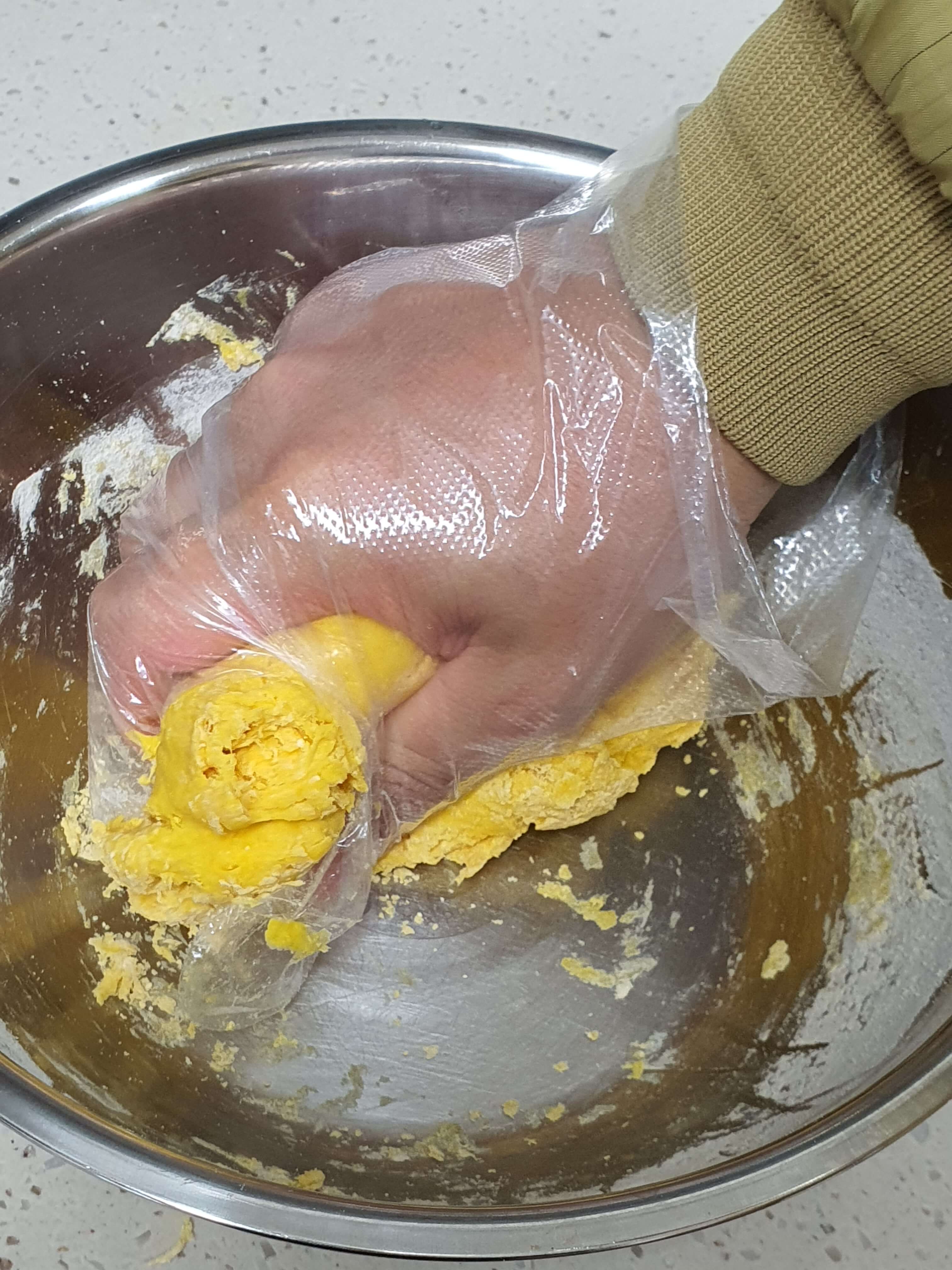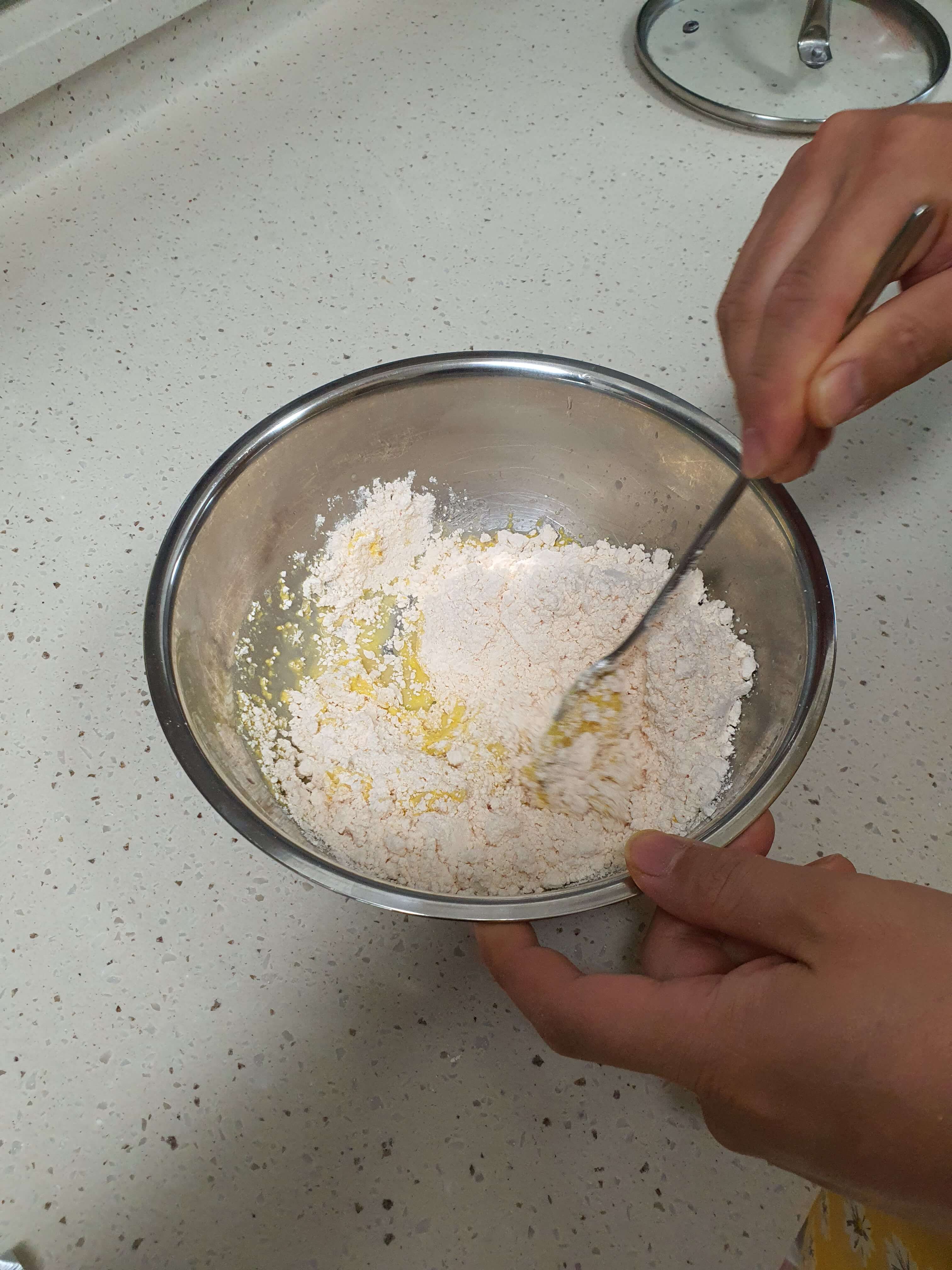 3. 식용유를 손에 발라 반죽이 들러붙지 않게 만들어 준 다음 완성된 반죽을 조금 떼내어 납작하게 만들고 속재료를 넣은 후 잘 오므려 줍니다.